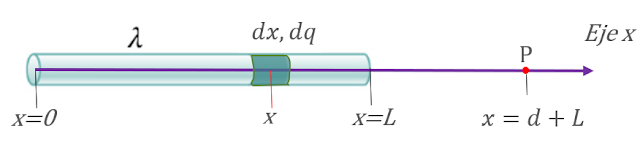 Calcular el campo eléctrico producido por una barra delgada de longitud L, cargada uniformemente con carga total Q, en el punto P mostrado en la figura, el cual dista una distancia d del extremo derecho de la barra: